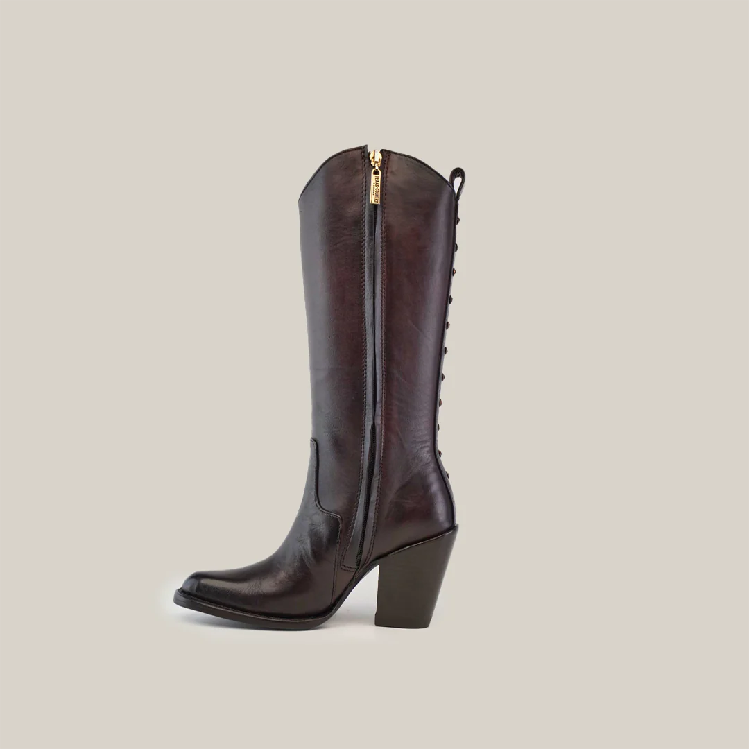 The Francia Rings Tall Shaft Chocolate boot represents pure luxury in our Platinum Collection. Masterfully handcrafted by elite artisans, this J toe design showcases premium leather with stunning detail. Women consistently praise its elegant silhouette and sophisticated ring accents. The leather sole enhances the boot's refined character, while the rich chocolate hue elevates any ensemble. Each stitch reflects our commitment to excellence, making these boots a treasured addition to any fashion-forward wardrobe.