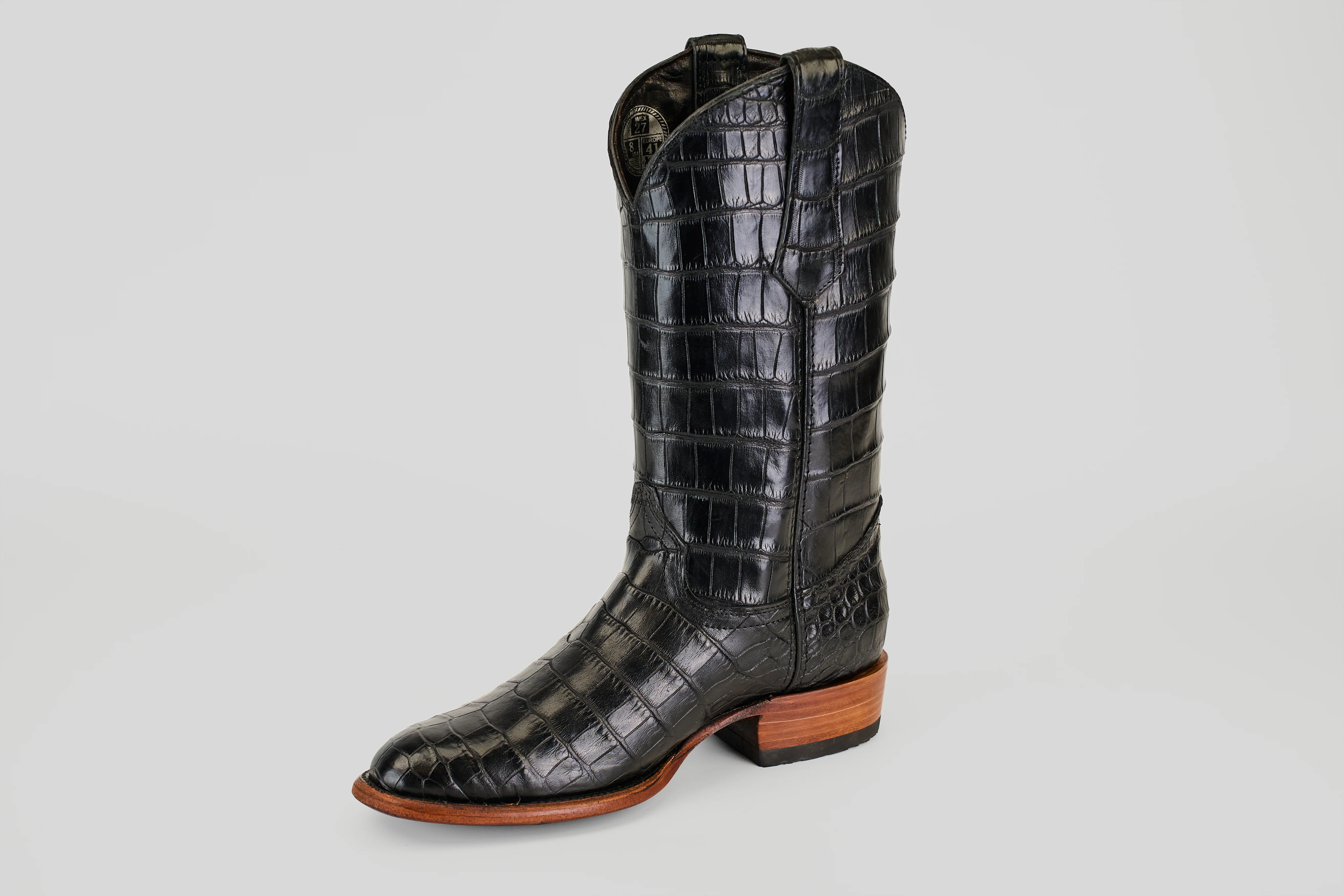 The Exotic Full American Alligator Boot in Black with Round Toe represents unmatched craftsmanship and sophistication. This masterpiece features premium alligator leather, showcasing natural patterns that make each pair unique. Paired perfectly with our luxury briefcase, this ensemble creates an impeccable statement of refined taste and success.